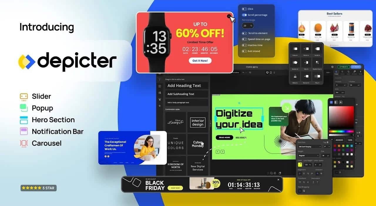 Depicter Your ultimate Solution for Interactive WordPress Sliders, Responsive Popups, and Dynamic Notification Bars. Effective ways to grab your visitors attention, keep them engaged, and lower the chances of them leaving your site.